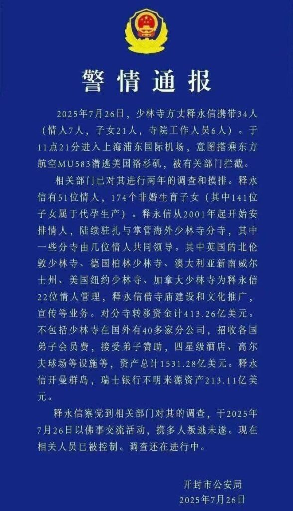 少林寺住持释永信因涉嫌刑事犯罪而受到关注,具体指控包括挪用和侵占项目资金及寺院资产。此外,他还被指责严重违反佛教戒律,长期与多名女性保持不正当关系,并育有私生子。