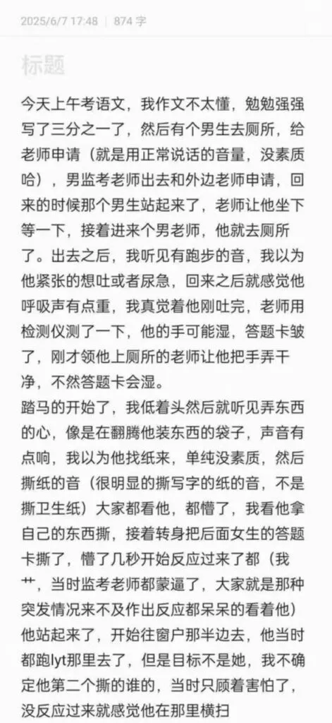 网传山东济宁邹城一中高考考场考生现场崩溃撕卷子