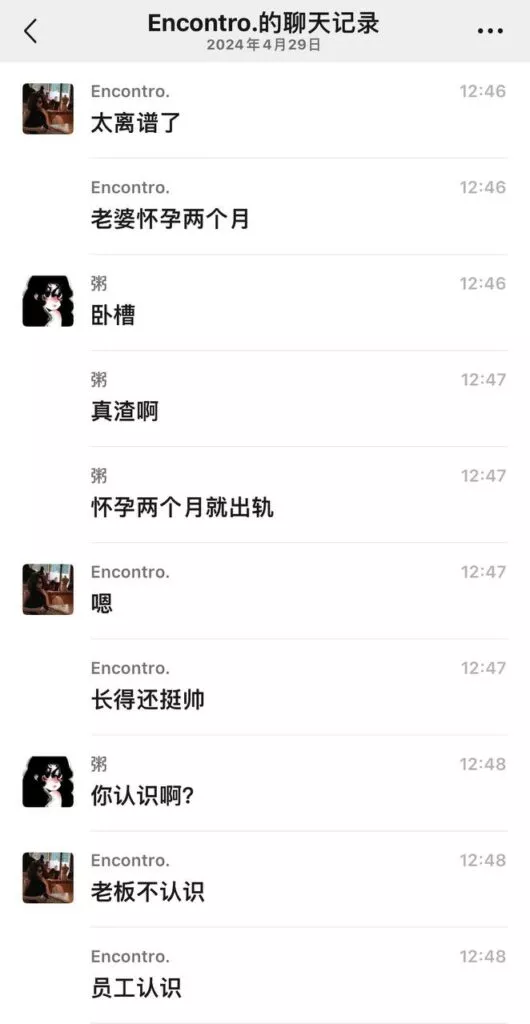 他的妻子正值怀孕期,他自己却出轨女下属,这个消息对她打击极大。她的父母得知后,愤怒且悲伤地带着李女士去找出轨男要求解释,希望他为行为负责,尊重并保护他们的女儿的权益。到达企业总部后,他们发现出轨男与小三在办公室,当着公司众人的面将两人暴打一顿。