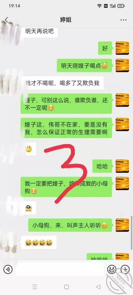 嫂子这个小母狗,真的是越来越大胆了,趁着国伟出去的时候居然与我调情,真的是搔啊,估计也是国伟回来,在床上没满足她,心里肯定不爽从聊天记录嫂子的语气中,不难看出,现在估计国伟在她心里,有没有都行了,在我这除了抱怨国伟,几乎就不说别的什么,估计在家里,跟国伟说的话,还不如跟我说的多呢,也是,谁让国伟满足不了自己的老婆呢,尤其是跟嫂子玩完SM,公厕,还有楼梯间后,现在我不光是拿下了嫂子的身体,也是征服了嫂子的心,这个小母狗其实内心就有一颗狂野的心,希望被人驯服,只是国伟没有开发出来!既然国伟没开发出来,只能是我来开发了,哈哈哈