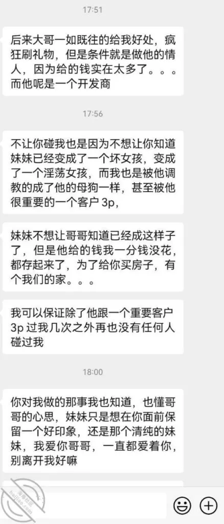 可昨天趁着妹妹洗澡的空档,快速翻看了她的手机,见有一个比较男性的头像点开,看到消息之后感觉天都要塌下来了,, 里面消息不多,只有最近几条, 应该是妹妹每次聊完都把消息删除了,就银秽不堪的信息,把我对妹妹美好的梦击碎了。