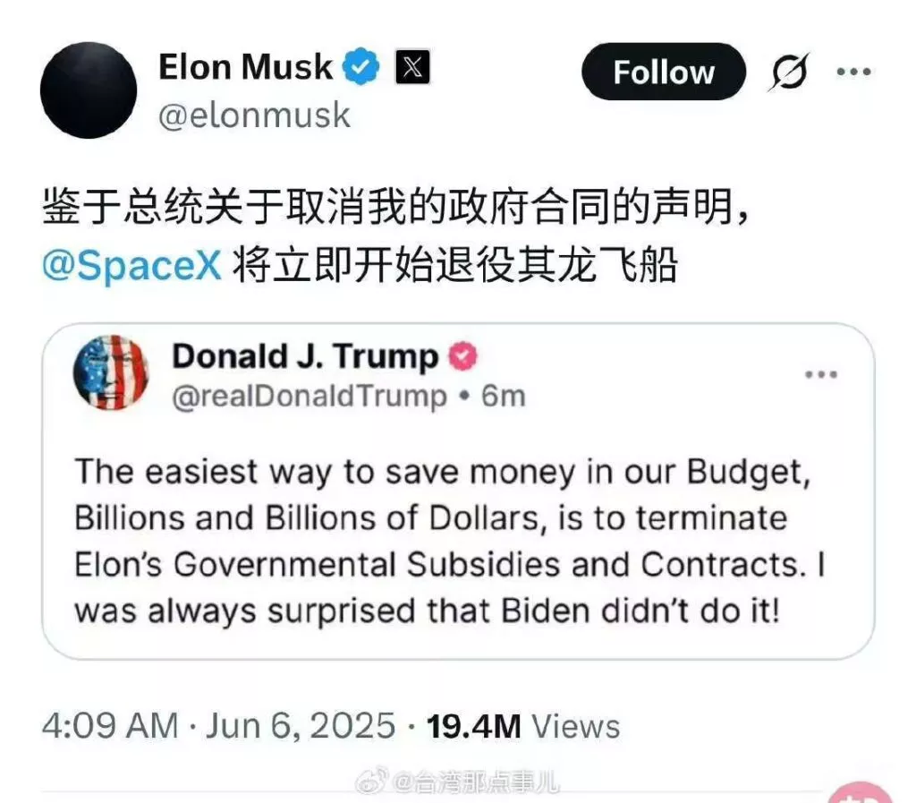 6月3日,特朗普在他的社交平台上回怼,说马斯克是因为拿不到补贴才不爽,还放话要砍掉SpaceX和Starlink的政府合同。