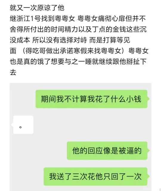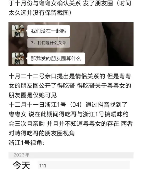 简要:与粤粤女掰扯半年确定了关系但出轨已知浙江1号和浙江2号以谈恋爱名义来广州与粤粤女发生关系后转头就和浙江2号去了上海约会得吃哥与粤粤女相识于2022年年末于2023年8月底开始常聊至2024年2月18日 在这之前只会偶尔联系加朋友圈互动