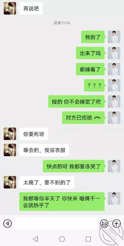JB都冻的不好使了 一直等到11点多 确认我爸妈都睡觉了 我才敢出去 叫我嫂子 我嫂子不回我 我给她发的语音 她秒挂了 哈哈 吓吓她 要不她不出来,我还以为她睡着了 果然发完语音没一会就出来了