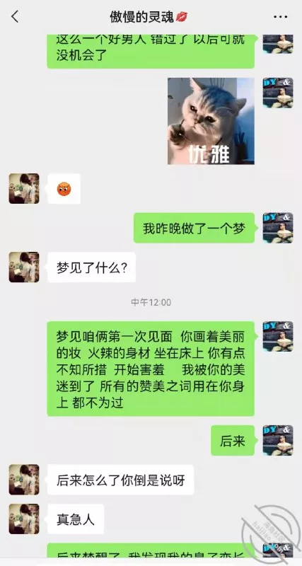 今天我嫂子心情大好 高兴的像个孩子一样 我问她为什么这么开心 我嫂子说:要过年了 就应该有个喜气样 !我心里(呵呵了) 突然说了一切我真怕她接受不了 从我这次回归以后一直在强调这个问题 ! 突破突破!要不还是下药?唉!想不出太好的办法,我都有些从这个梦里出不来了,聊到最后 自己都入了戏 !聊天记录节选一段送给你们