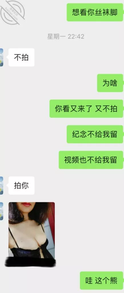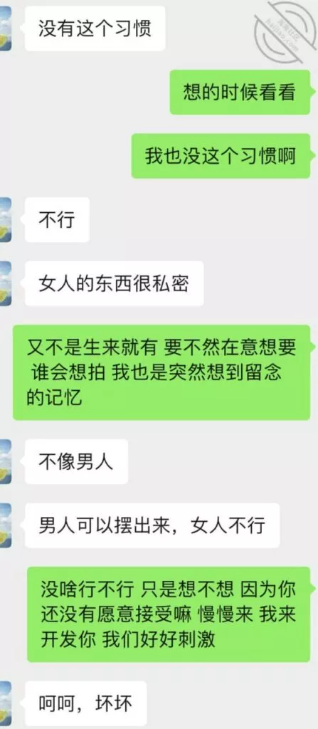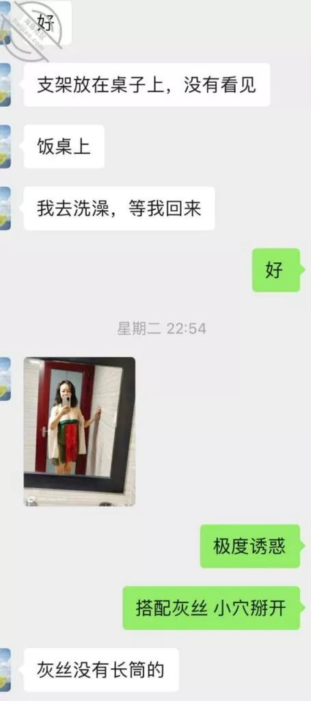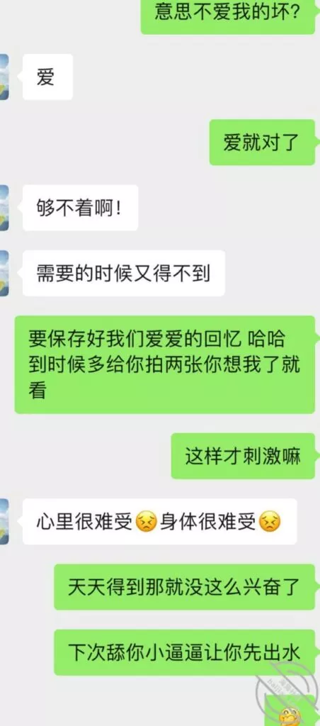 不过第三次虽然也没成功拍到照片和视频但是她开始松口至少穿情趣了而且在我引导下还主动给我发照片看,按后来她说 穿上情趣看自己照片 自己下面都受不了并且说第一次干涩 第二次有点水,那么第三次直接是润滑到极限,被我撩搔的不行不行,想到下面现在就会湿润。