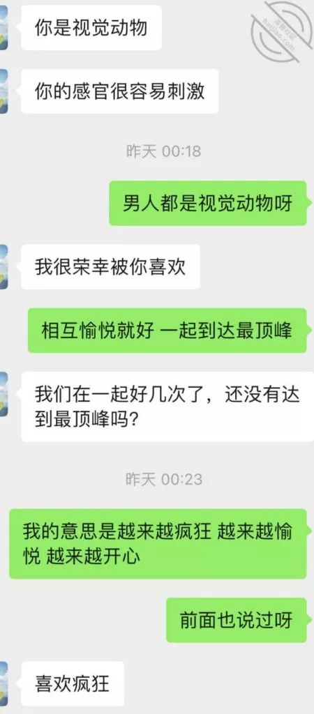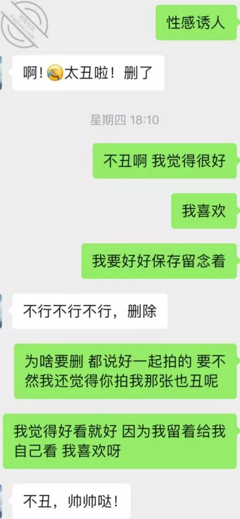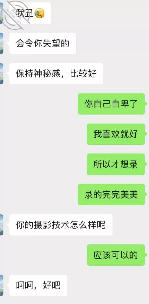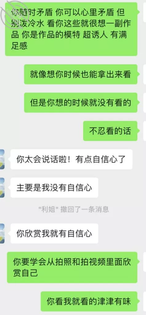 这一次她自己都体会到,拍给我的时候要越来越搔才能更诱惑我,所以这次自拍的比前几次自拍要好很多,的确是看着这老熟女利姐都不能自拔。多说无益,上聊天记录