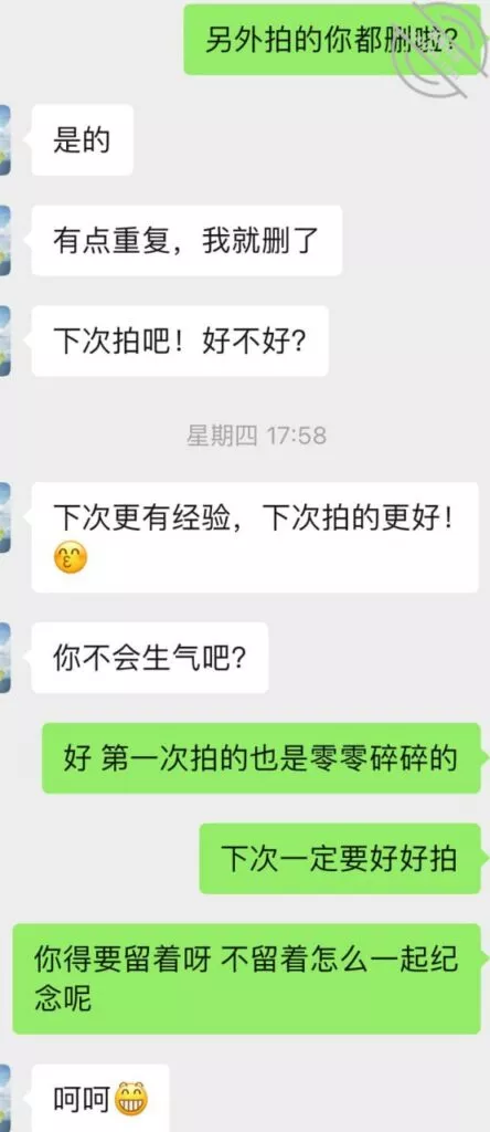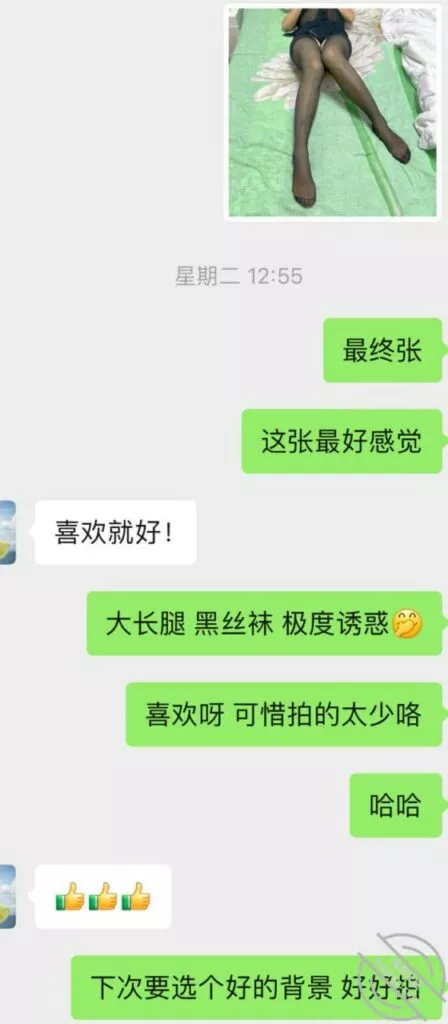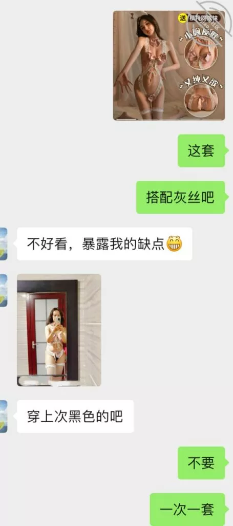 时间来到第三次前,又开始撩搔和我,我就提前撩到让她穿丝袜情趣等拍照,但是她还是没有答应,理解不了说年轻人的癖好,我直接就把我喜欢类型的情趣链接发给她让她去看选择,而后果然也是当她聊完就买了不同款式三套,并且我侧面和她聊拍照录像,因为她总是想纪念我一次顺水推舟和她说第三次要进行拍照录视频让她放开。