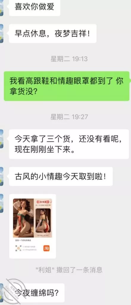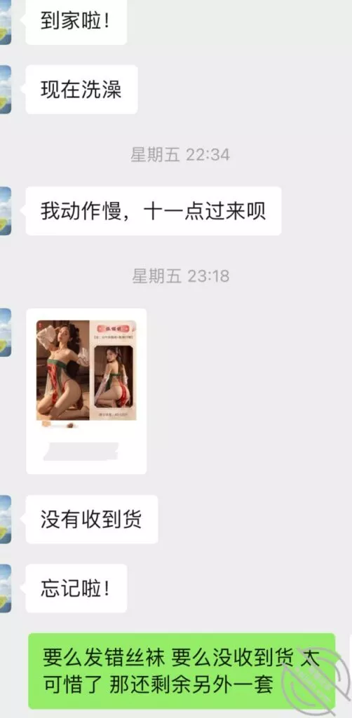 大概第五次结束后有两三天没联系吧,前面给利姐买了情趣高跟海友更多的情趣眼罩丝袜我看了一眼显示到货了,所以督促让她拿一下怕她忘记。